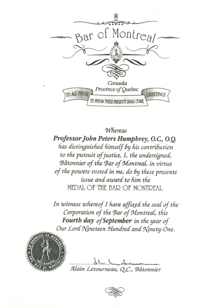John Peters Humphrey, Medal of the Bar of Montreal, n.d.